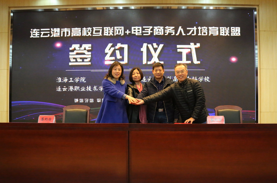 bet365体育投注站党委书记周清华代表淮海工学院与阿里巴巴项目进行百城千校百万英才跨境电商培训基地签约。应用技术学院院长樊华代表淮海工学院与连云港师专、连云港职技院和江苏省财职院一起共同签定连云港市高校互联网+电子商务人才培育联盟合约。