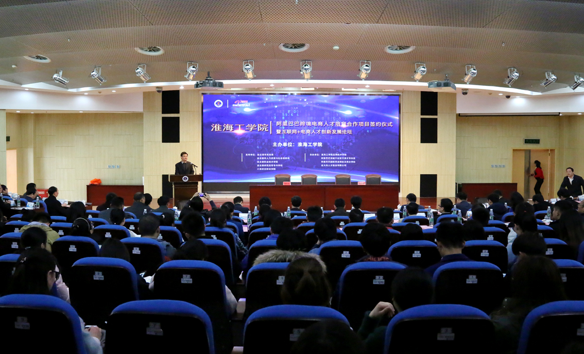 3月25日,淮海工学院在黄海厅隆重举行“2017阿里巴巴跨境电商人才培育基地签约仪式暨互联网+电子商务人才创新发展论坛”.连云港市政府副市长吴海云,淮海工学院党委副书记副校长宁晓明,连云港市政府副秘书长徐岳听先生、阿里巴巴集团BD专家刘华先生、连云港市商务局局长任瑜先生、连云港市人社局副局长邵晓峰先生、连云港市商务局副局长刘明台先生、阿里巴巴华东区资深经理杨志浩先生及连云港海关,连云港国检,连云港国税,外汇管理局和县区商务局的各位分管领导和连云港市各大中专院校相关领导出席本次会议,约300多名师生参加本次活动。淮海工学院院教务处处长李纪明主持本次会议。