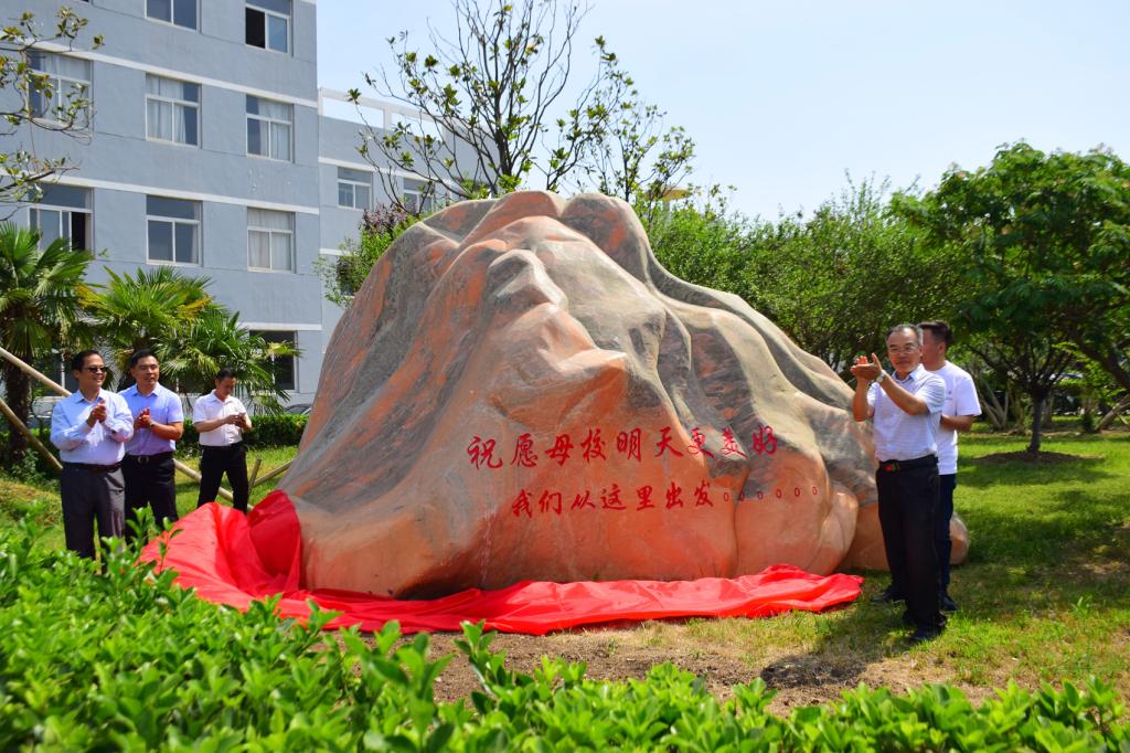 同窗盐校同业同心,共聚母校共创共赢。5月29日,三百余名93级校友换上带有班级特色的纪念衫,相聚在淮海工学院宋跳校区,饮水思源,心系母校,回到峥嵘岁月的起点。上午9点,学院领导及校友在厚德楼前见证了93级校友赠母校景观石的捐赠仪式。我院党委书记周清华老师、院长樊华老师以及校友代表史炳清、李雪涛共同为景观石揭幕。樊华老师在讲话中对校友返校表示了热烈的欢迎,校友代表许文军则表达了对母校的深深感恩。仪式结束,该院领导及93级校友纷纷合影留念,定格了二十年后再次重逢的珍贵时刻。景观石的正面镌刻着“祝愿母校明天更美好,我们从这里出发”的字样,是93级校友的如火青春、二十年同窗之情的缩影,是对原江苏盐校、现在的淮海工学院的感谢,更是对未来的江苏海洋大学的憧憬。