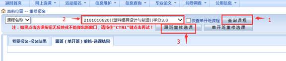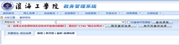 第三步、点击“查询课程”按钮,在其左边下拉列表中选择本学期可以跟班重修的课程名称,再点击“跟班重修选课”。单开重修班的课程,在点击“查询课程”按钮前先勾选“仅查单开班课程”,然后再按课程代码选择正确的课程后点击 “单开班重修信息”。